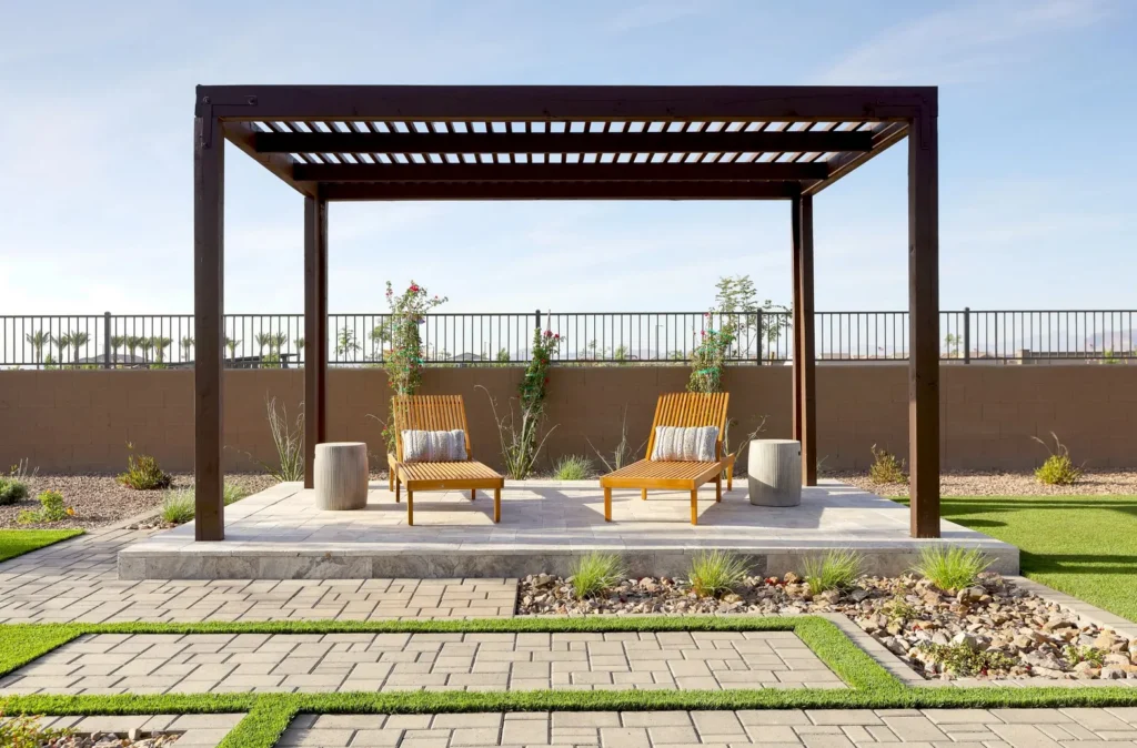 The pergola supports lighting and ceiling fans, turning the area into a true outdoor “room.”